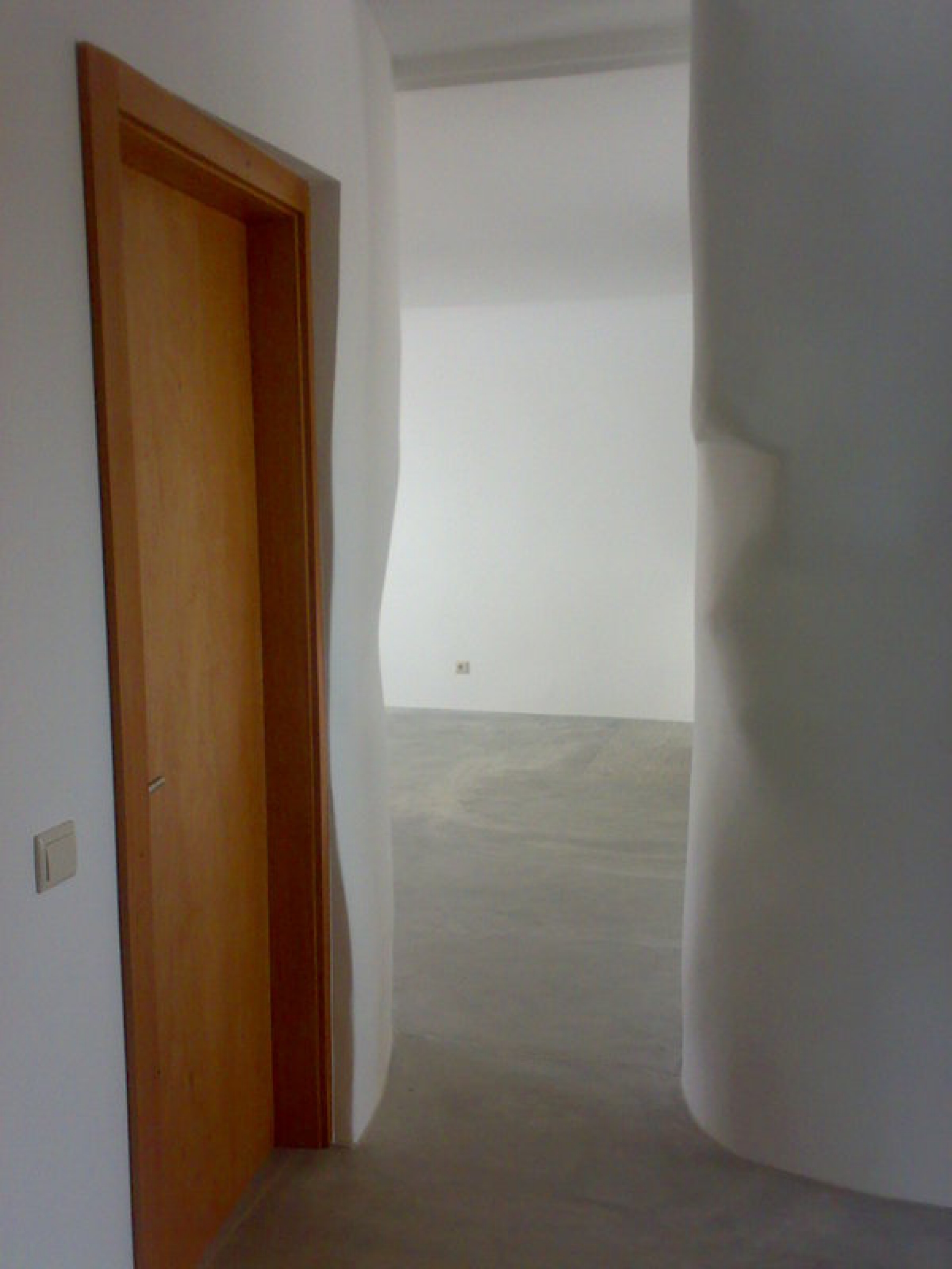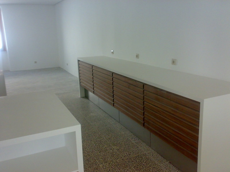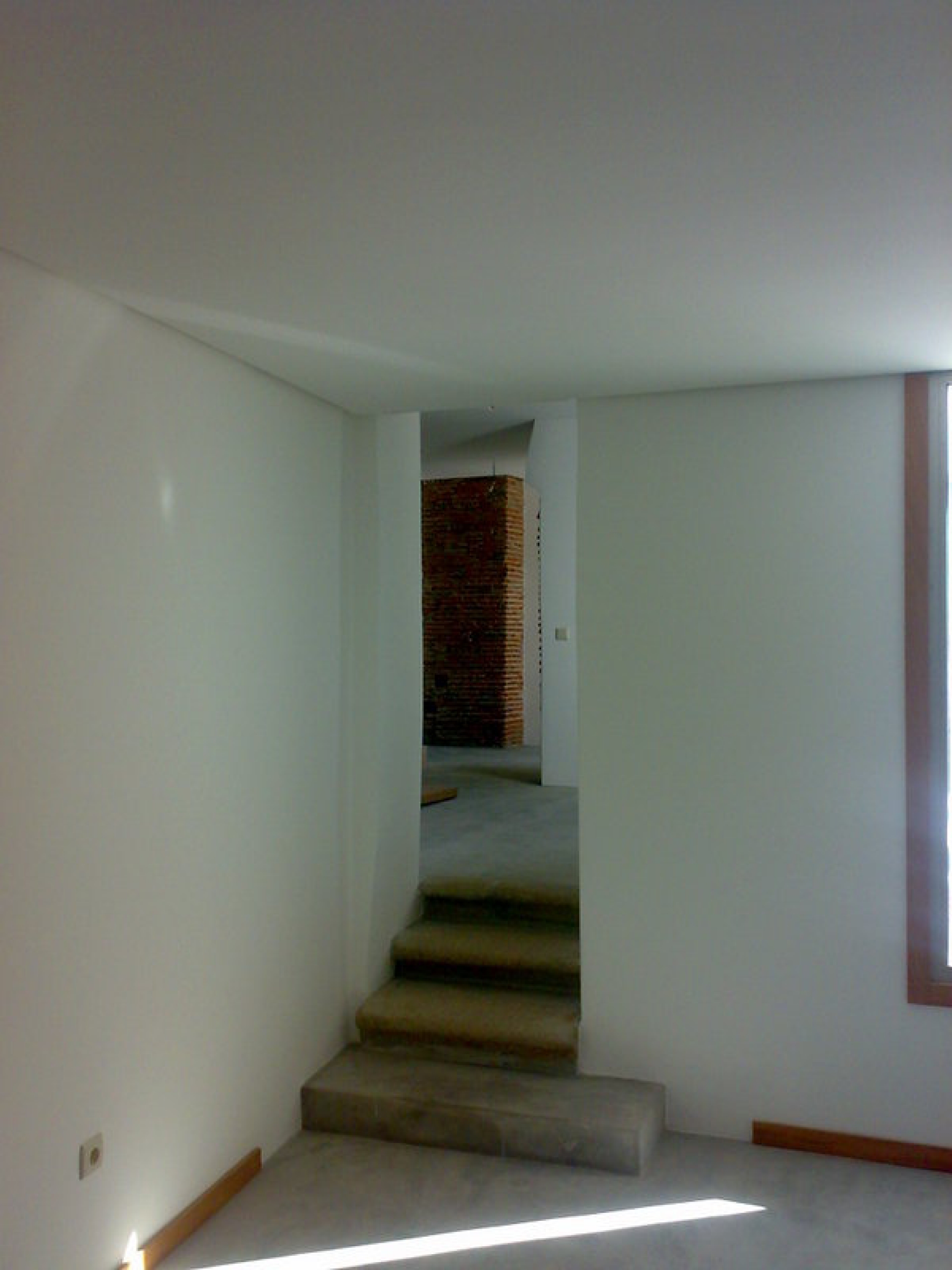 As paredes de tabique existente foram reforçadas com betão armada projectado e acabadas a reboco estanhado a coler