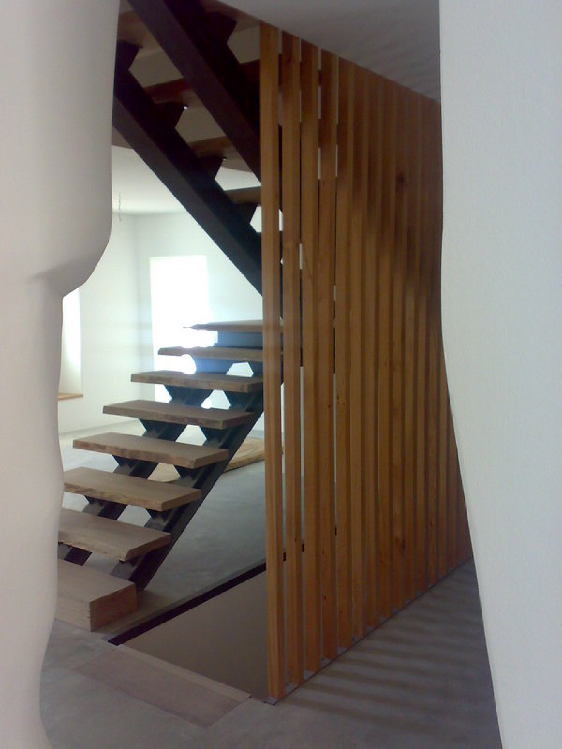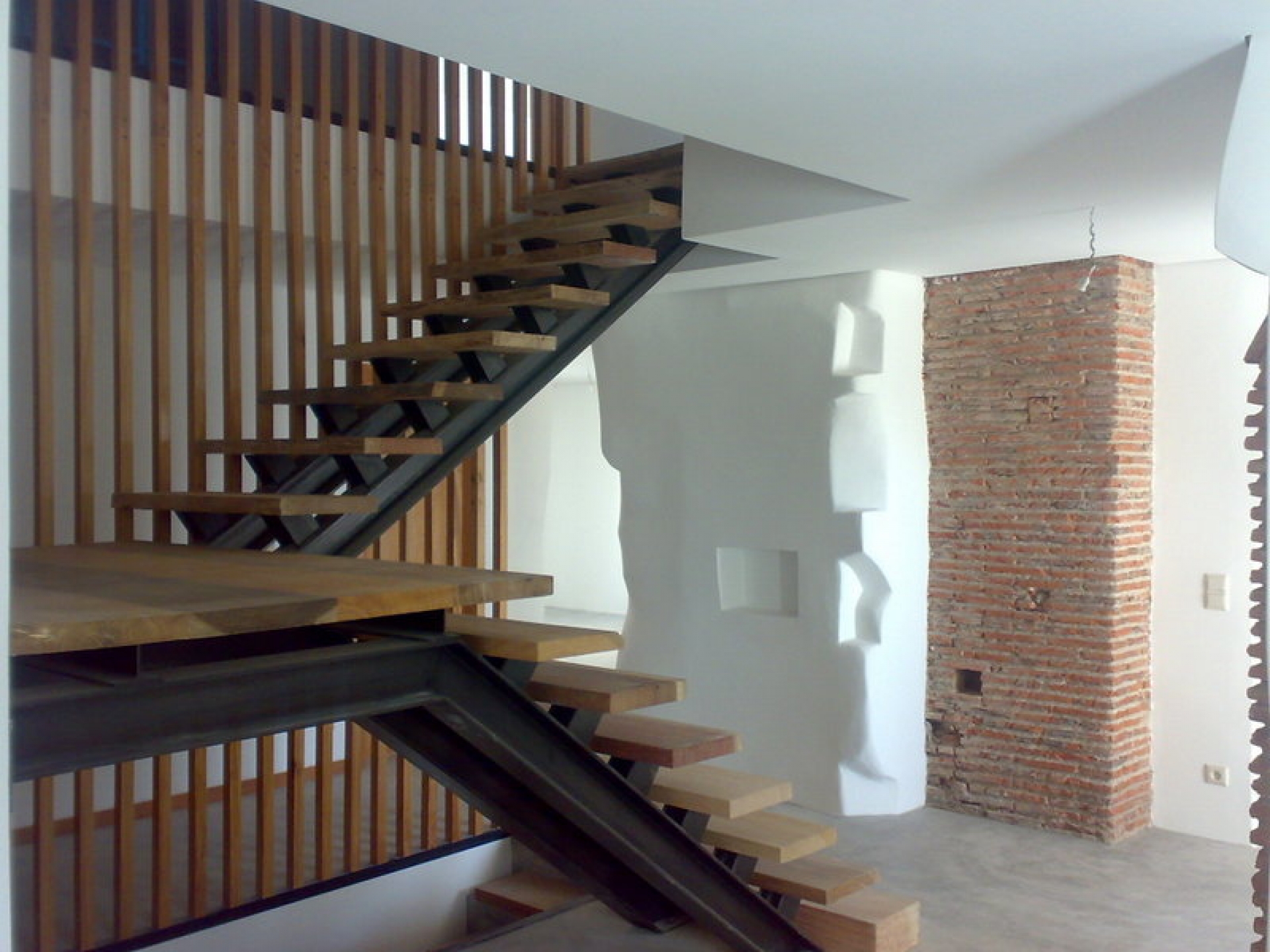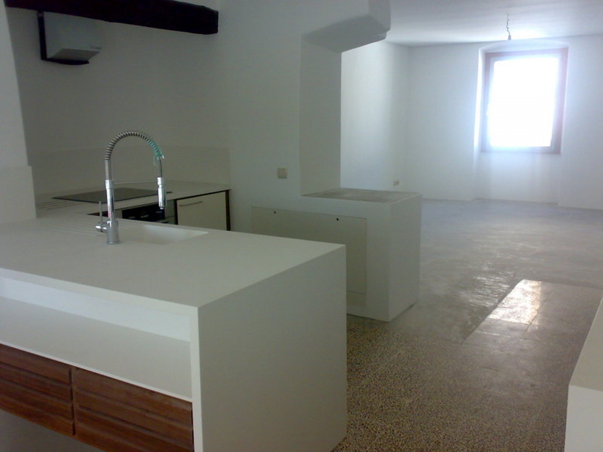 As paredes de tabique existente foram reforçadas com betão armada projectado e acabadas a reboco estanhado a coler